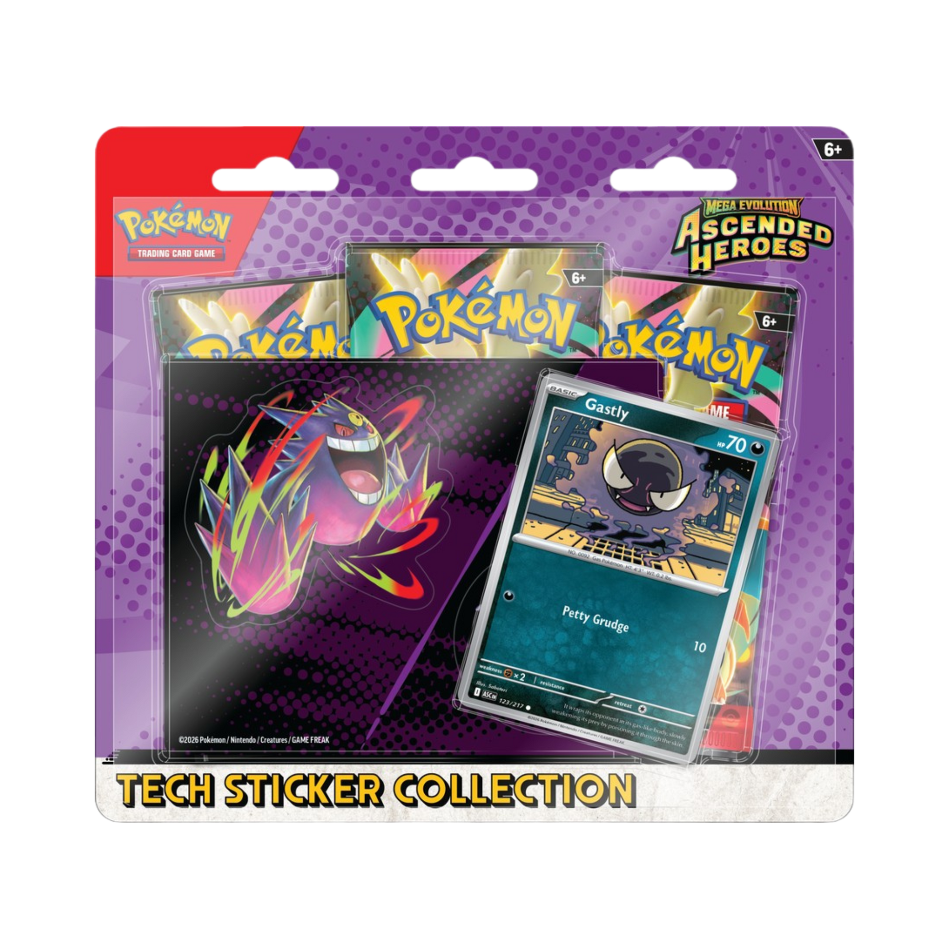 Bring haunting style to your collection with this Ascended Heroes Tech Sticker Collection featuring a foil Gastly promo card and a vibrant sticker sheet alongside three booster packs from the Mega Evolution—Ascended Heroes set.