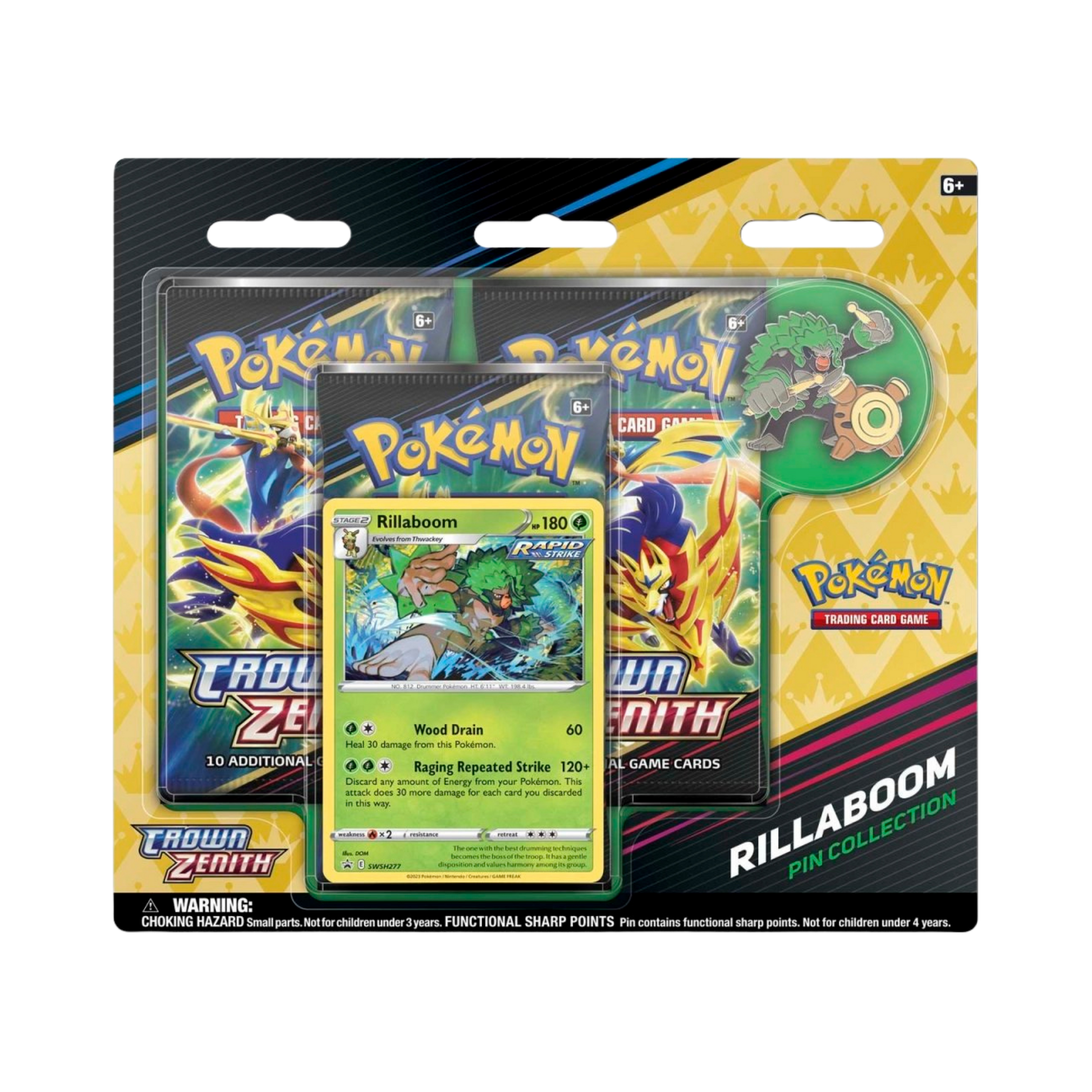 The Crown Zenith Pin Collection [Rillaboom] is a sealed Pokemon TCG retail blister that includes three Crown Zenith booster packs alongside a foil promo card featuring Rillaboom and a matching collector enamel pin.