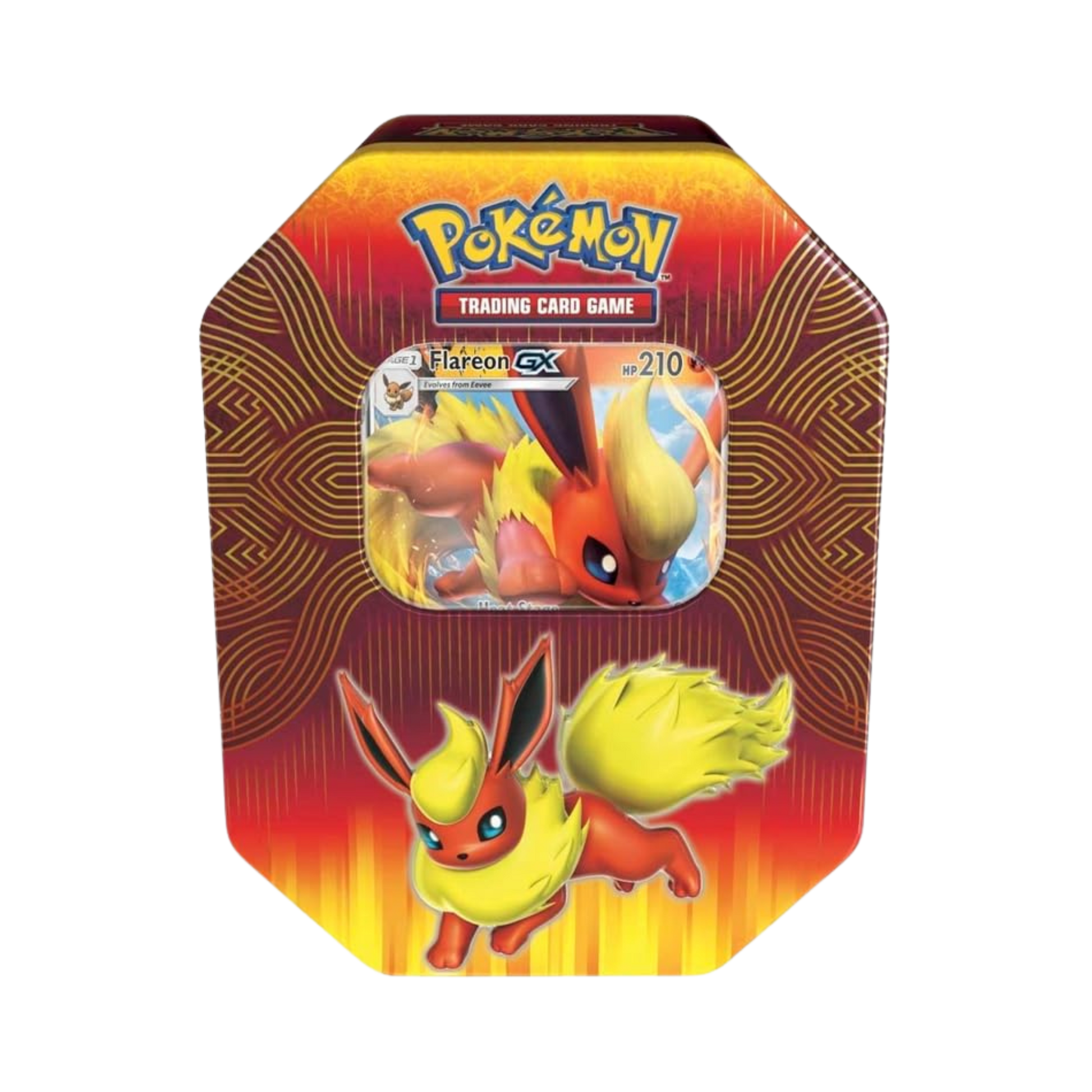 The Elemental Powers Tin featuring Flareon-GX brings the heat with a foil promo and four booster packs from the Sun & Moon era. A fiery choice for collectors and trainers looking to power up with one of Eevee’s most iconic evolutions.
