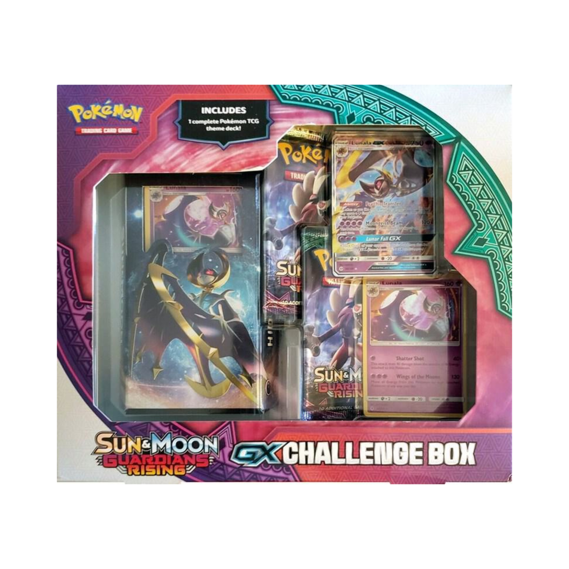 The Lunala GX Challenge Box is built for players who want a complete deck plus extra sealed product in one package. At its core is the Hidden Moon theme deck, a 60-card build centered around Lunala and Psychic-type strategies, ready to shuffle and play immediately. You also get both a standard-size Lunala-GX card and an oversize display version to showcase this Legendary Pokemon.